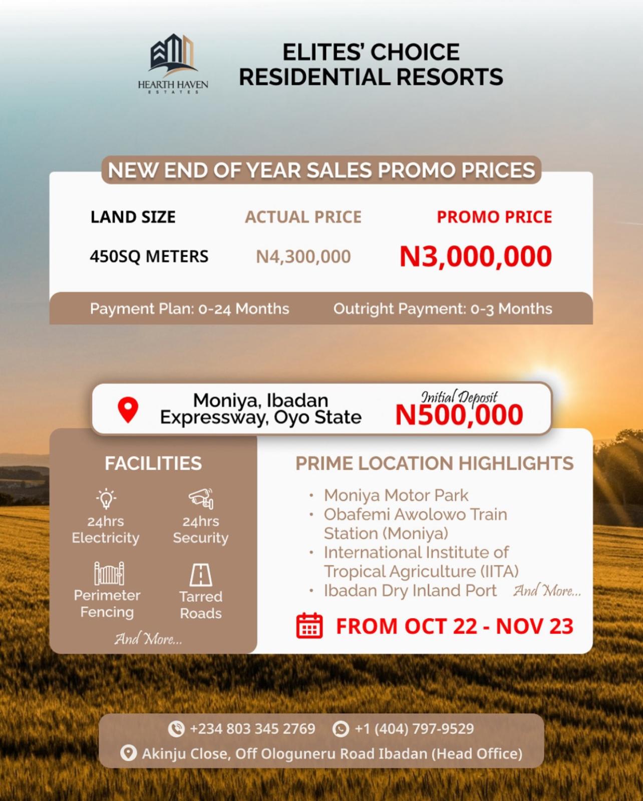 Elites’ Choice Residential Resorts Moniya-Ibadan Road, Oyo State (Directly Facing the Moniya-Ibadan Express) Sale Favorite Share Print From #4,300,000 /300 sq meters